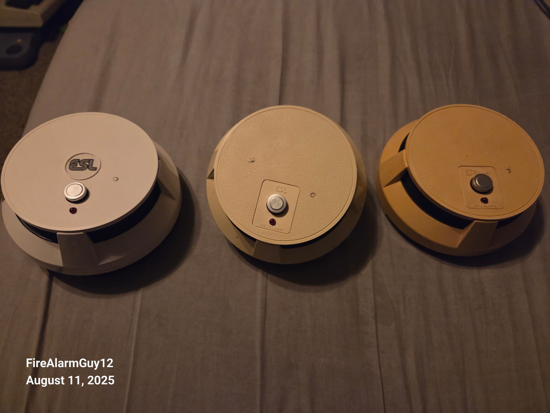 In the middle is my ESL 523D. Ignoring the fact it has a transformer on the back because it’s 120VAC, it does have some changes. First, the aforementioned bounding box around the heat sensor and LED is present. There’s also now text below the LED that reads “ON/ALARM”, as well as a smaller ESL logo above the heat sensor. This still uses the plug-in base, and feature the removal text. This is what I’ll call the 2nd Generation