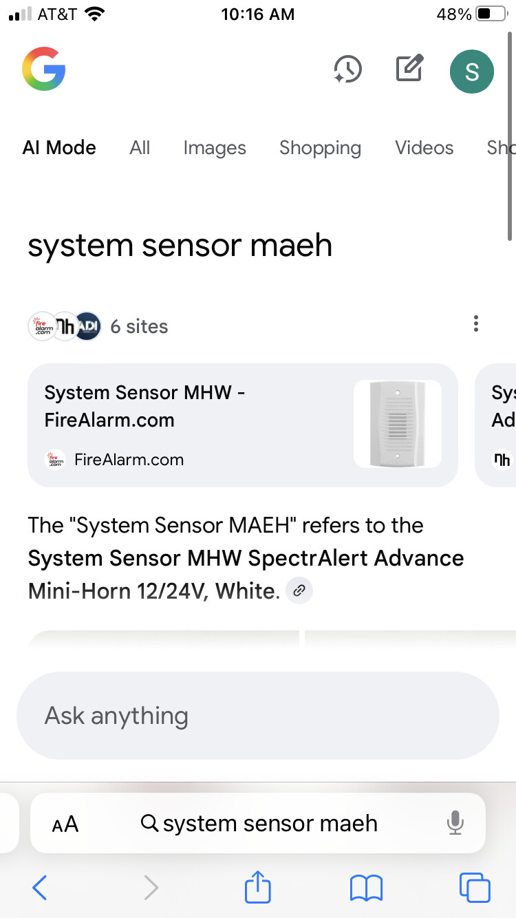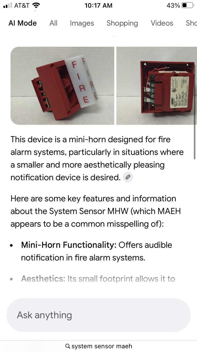 Like I said before: AIs definitely aren’t perfect right now, but if you give them enough time they might very well become much better. Just searching for things on Google without using its AI mode (which of course didn’t always exist) has worked fine for decades at this point too. I should also remind you that this topic is “Fire Alarm Memes!”, not “AI fails at finding life safety-related terms”.