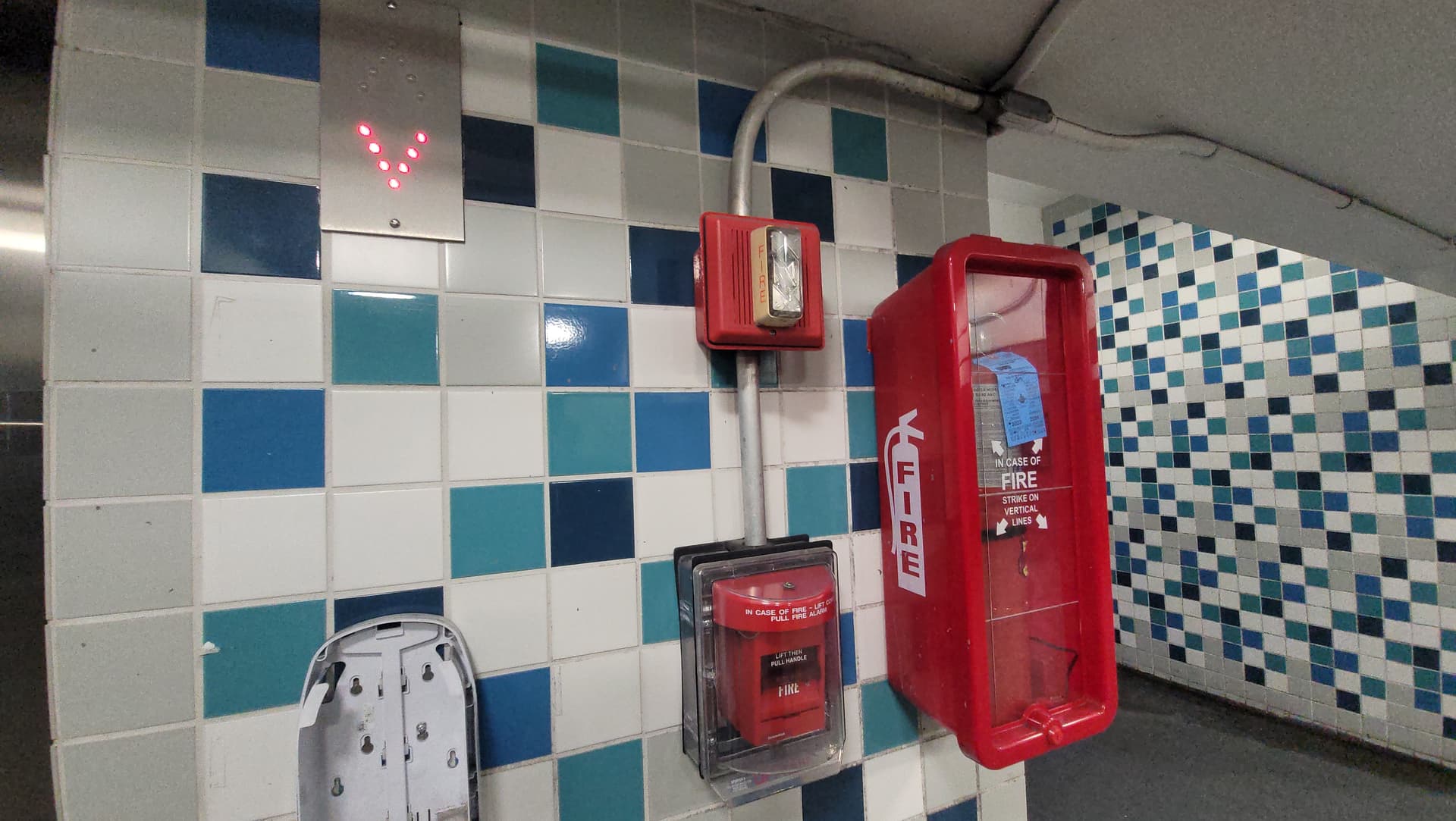 Same area I photographed last year, but now with an A4099-9006 pull station in place of the original Simplex 2099-9761. The older Simplex smoke detectors (largely 4098-9701 TrueAlarms and at least one replacement 4098-9714) were, not surprisingly, replaced with A4098-9714 TrueAlarm detectors.