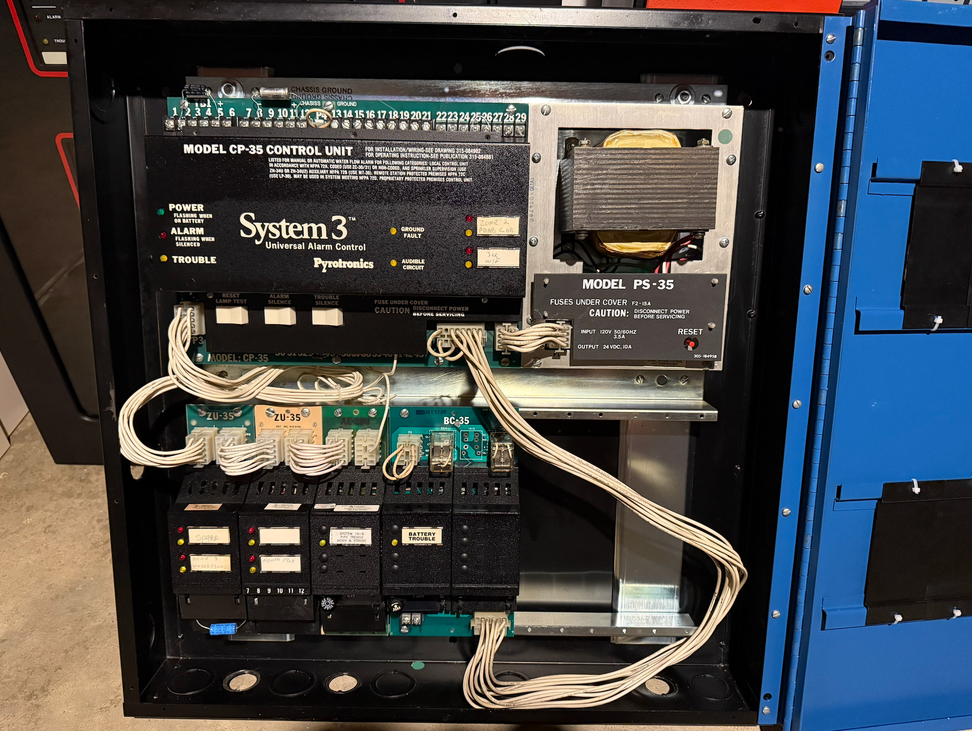 First up is a Honeywell FS90. This panel was released by Honeywell in 1986 as part of the “DeltaNet” line - a full building automation system offered by Honeywell at the time - as a complete fire and security system. These panels were extremely flexible and highly customizable, and could range from small conventional systems to very large and complex networked systems with addressable loops and support for voice evacuation. These panels were in production from their introduction in 1986 to roughly the early 2000s when they were superseded by the XLS-1000. This particular FS90 was manufactured in 1994 and consists of two bays of cards. Oddly enough, this panel did not have any zone or bell cards in it when it was installed originally. According to the stickers on the card cage covers, this panel had a main control card, a communications card, and a whole bunch of relay cards. I’m not sure how or what this was being used for originally, but I do know this panel was a part of a much, much larger Honeywell system. I did obtain two addressable loop cards, a display board for the addressable loops, and two zone cards - I’ll be adding these into the panel soon.