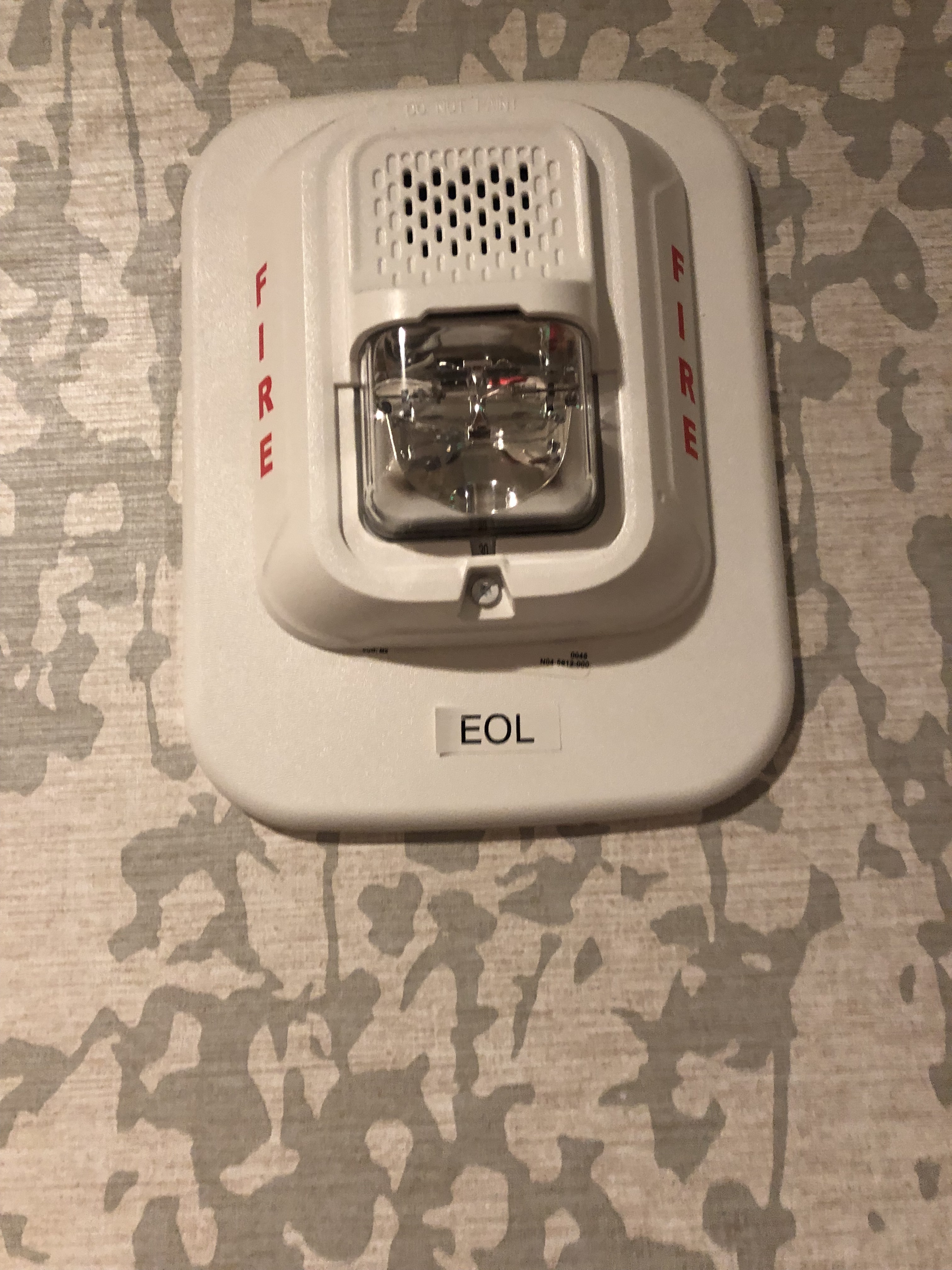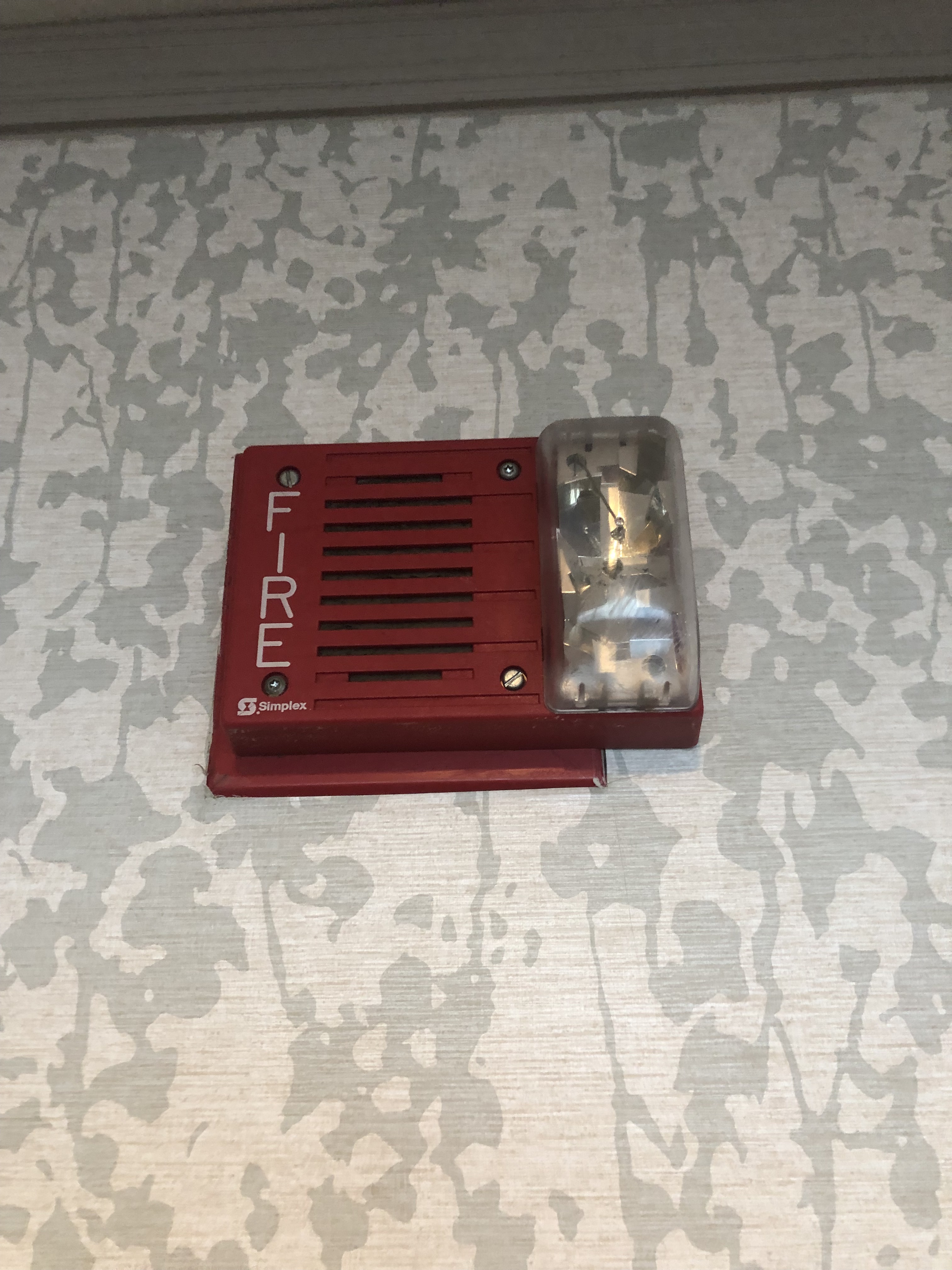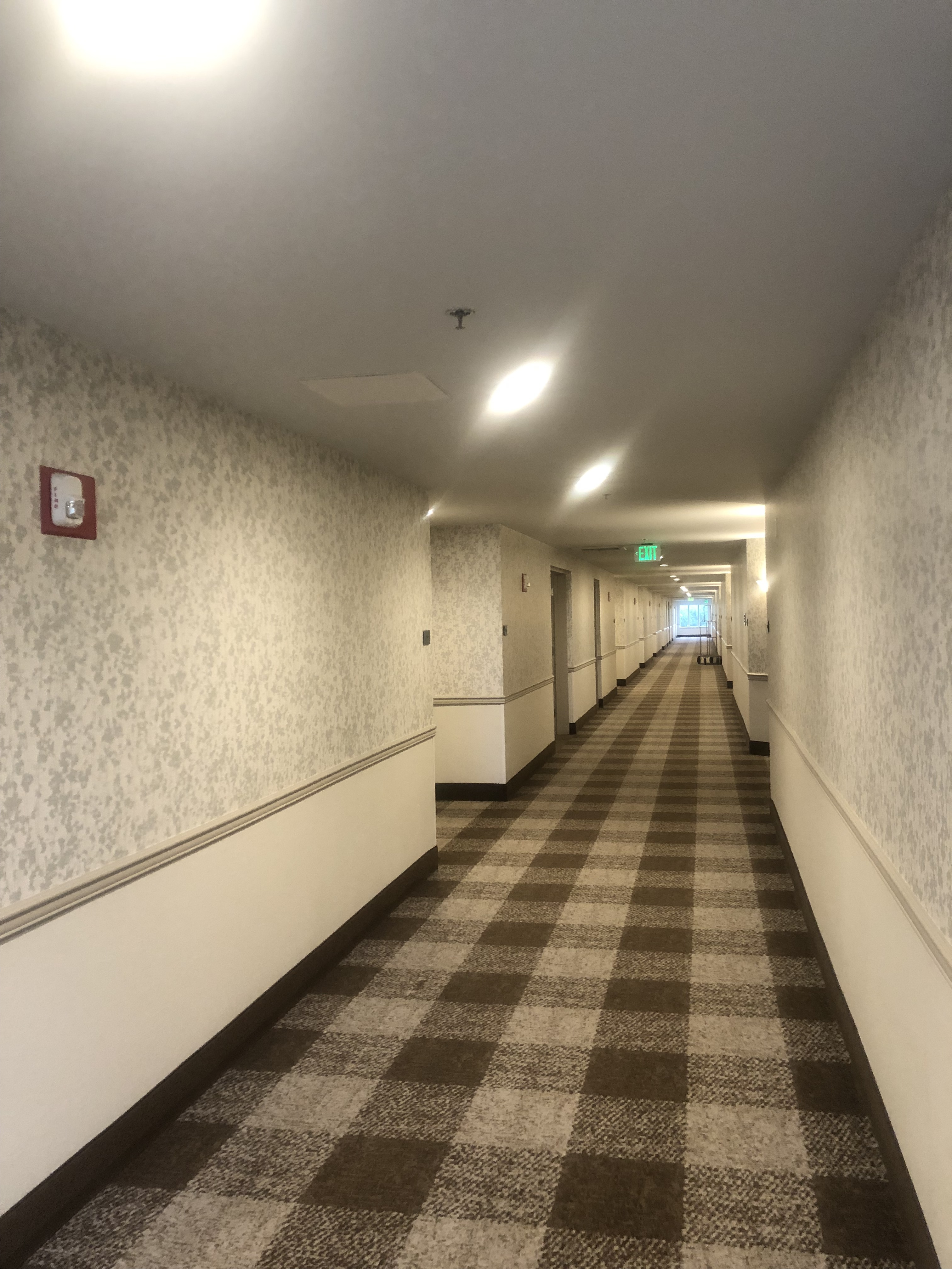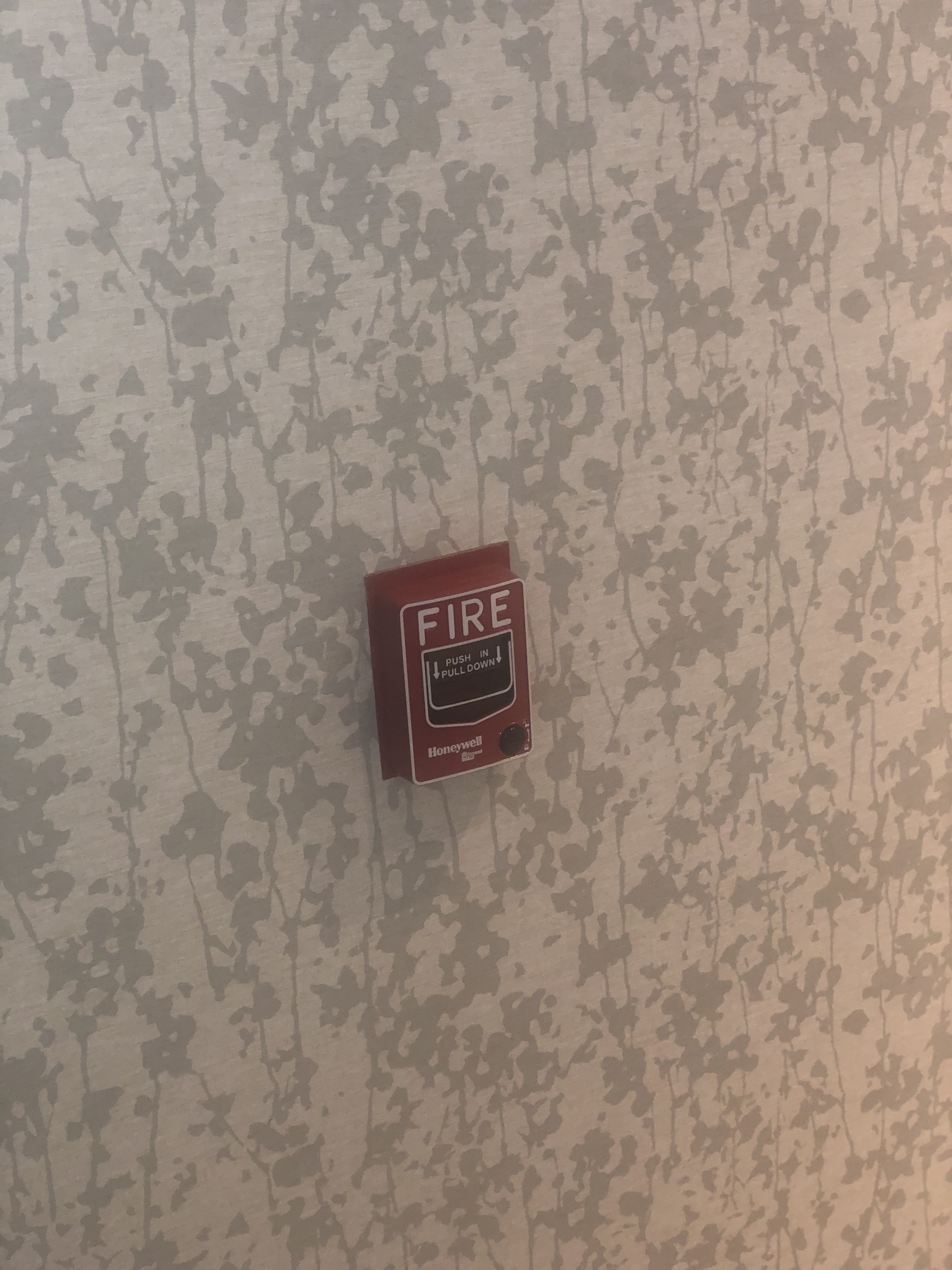 I can definitely tell that some of those devices replaced older/bigger ones going by the trim plates present. As for the residential smoke detectors outside of the rooms: I don’t know if they’re code-compliant being used in that way or not (probably not considering their normal intended use) but there probably should be commercial ones in their place instead. And yeah, the exit signs I’m sure aren’t up to code either, what with them being AC-only (though they look fairly new, & I believe battery backup has been standard in exit signs for quite a few decades, so why would there be one without it?).