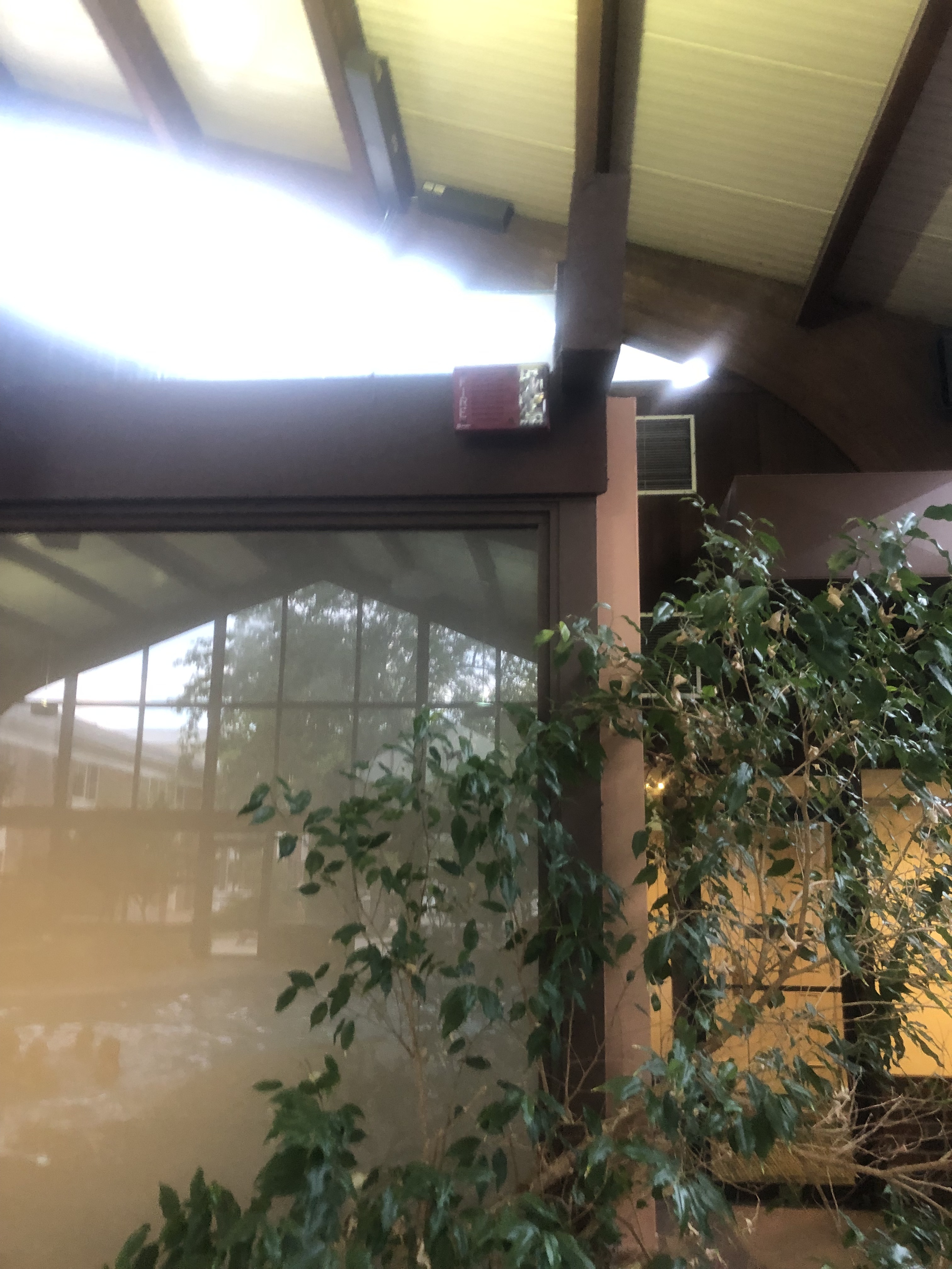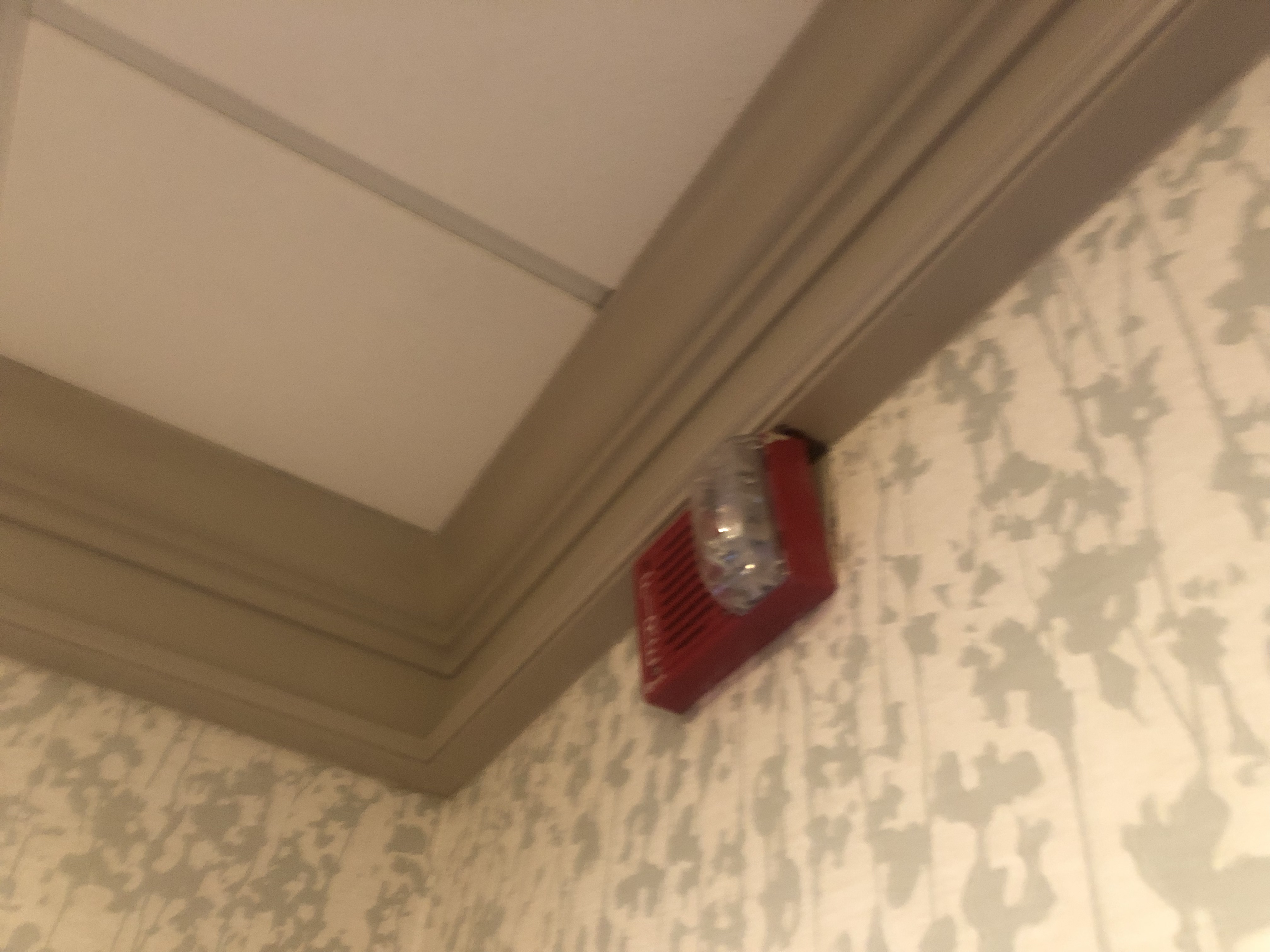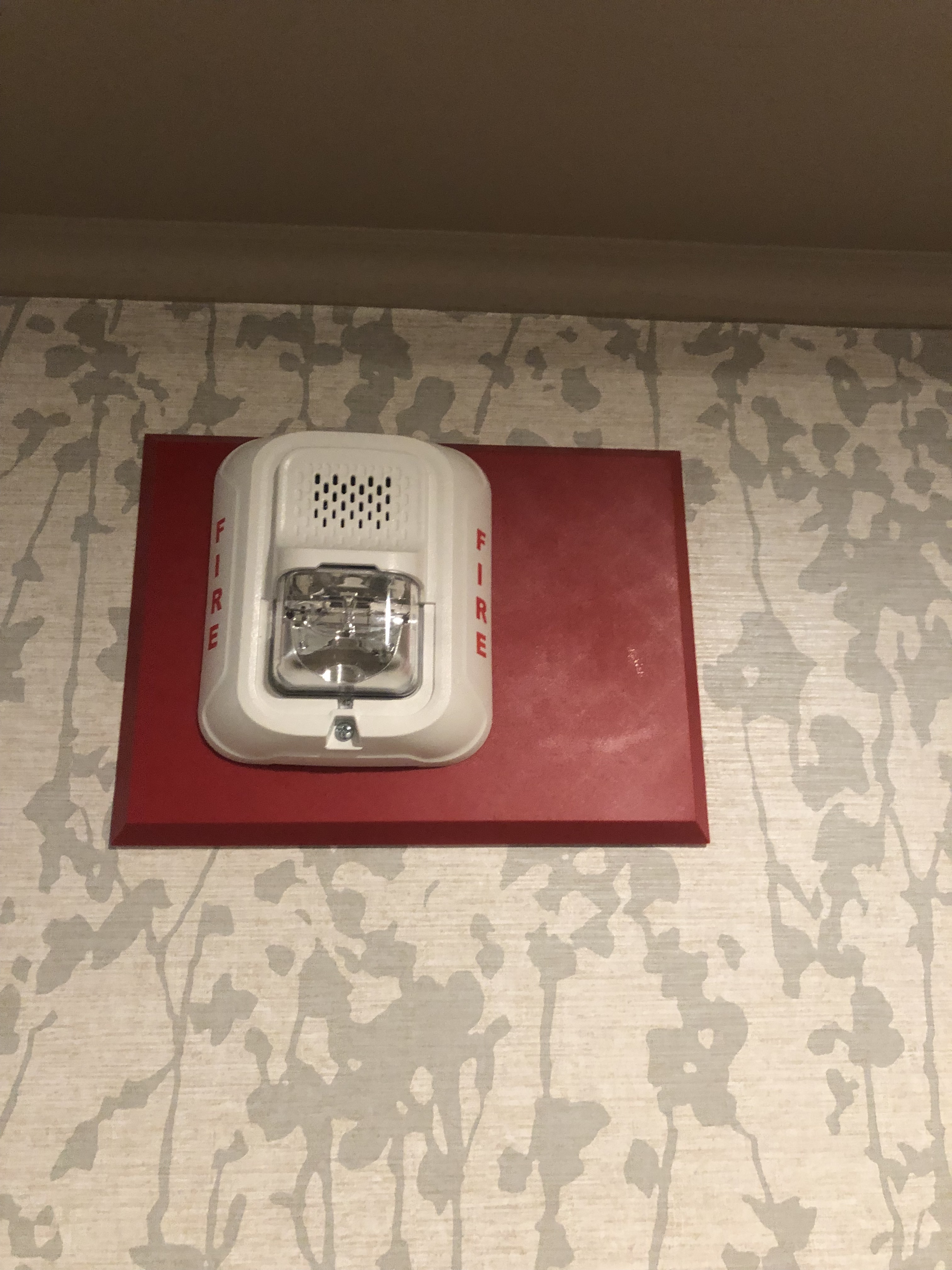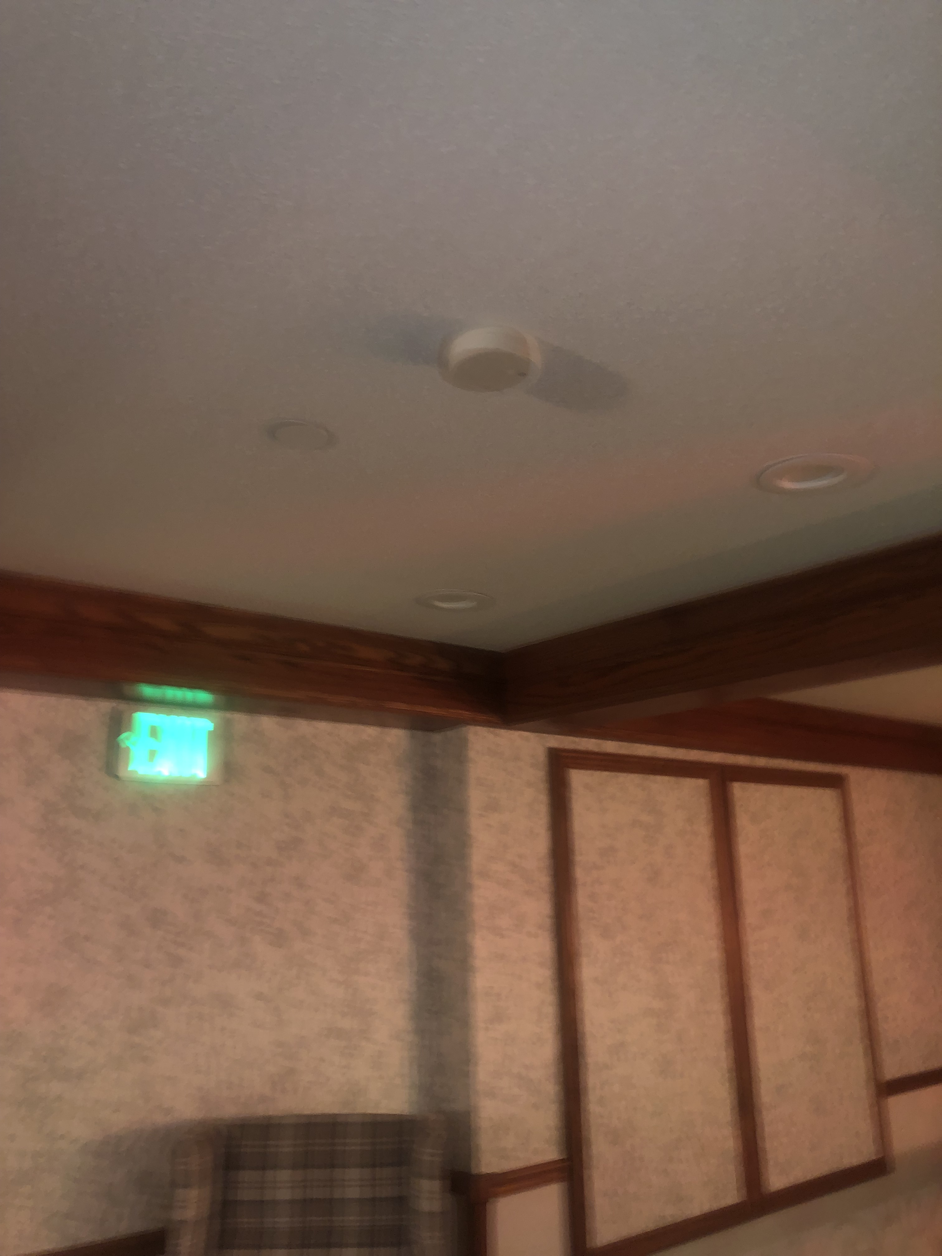 I can definitely tell that some of those devices replaced older/bigger ones going by the trim plates present. As for the residential smoke detectors outside of the rooms: I don’t know if they’re code-compliant being used in that way or not (probably not considering their normal intended use) but there probably should be commercial ones in their place instead. And yeah, the exit signs I’m sure aren’t up to code either, what with them being AC-only (though they look fairly new, & I believe battery backup has been standard in exit signs for quite a few decades, so why would there be one without it?).