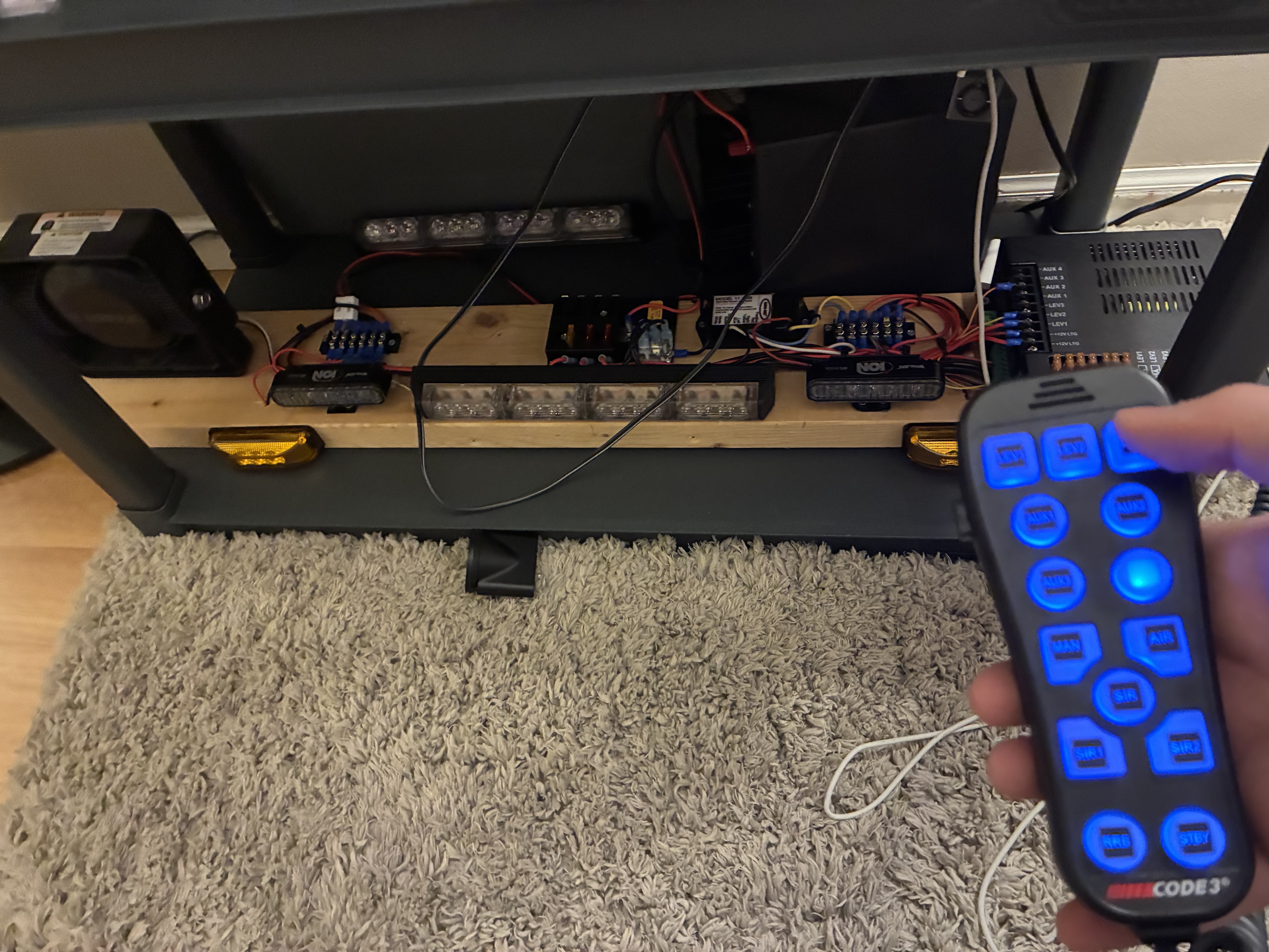 I got Mini Whelen ION lights, put them in my room, wired it, synced it, put it on a little block of wood (lightbar hahahahahgdsqhaqbh) and called it a day before I get a little 400-watt induced adrenaline rush.