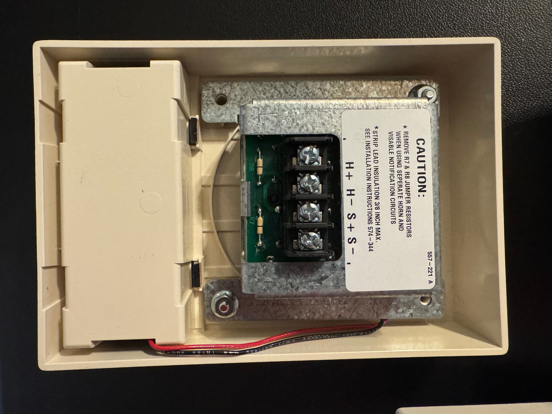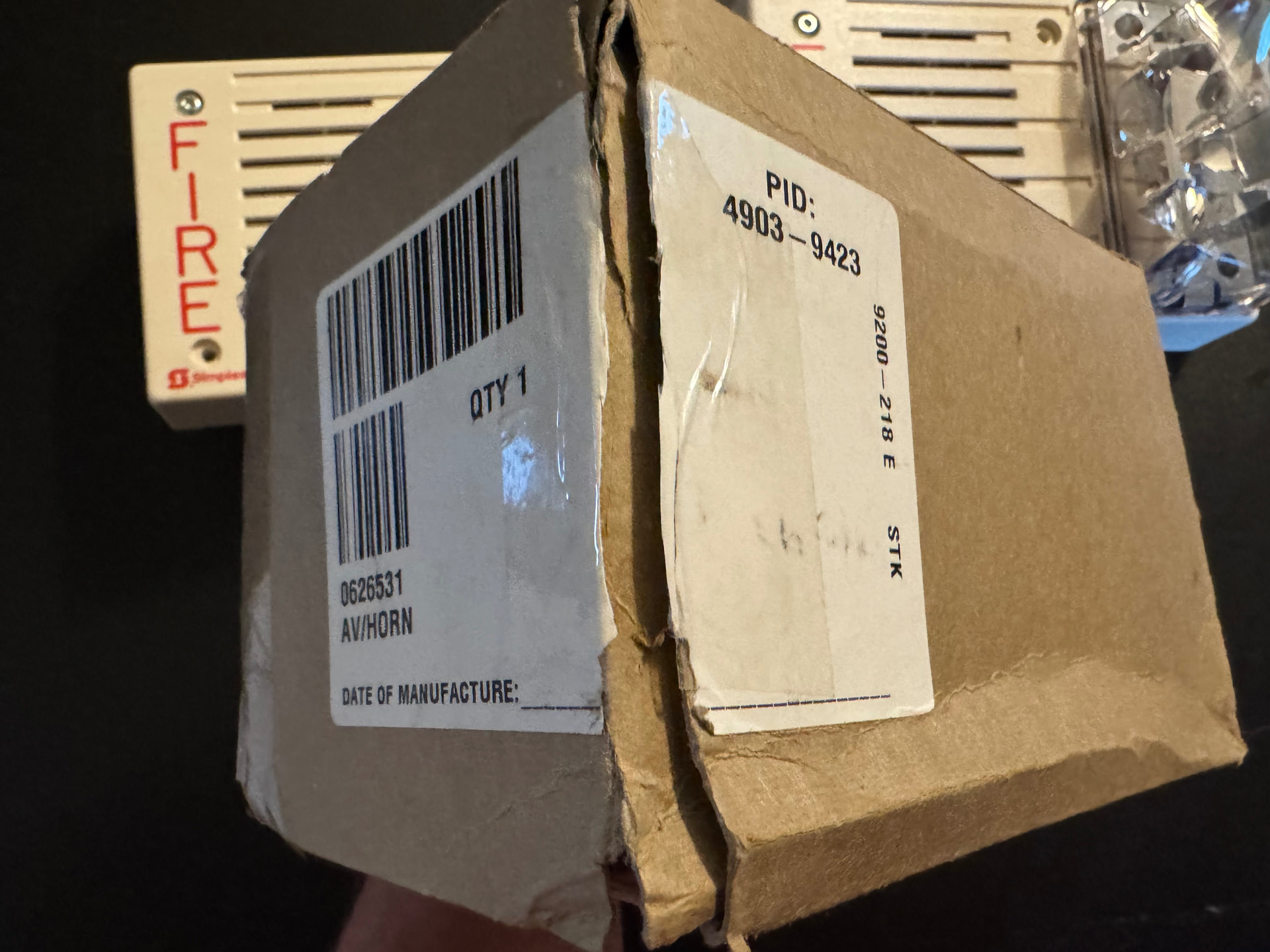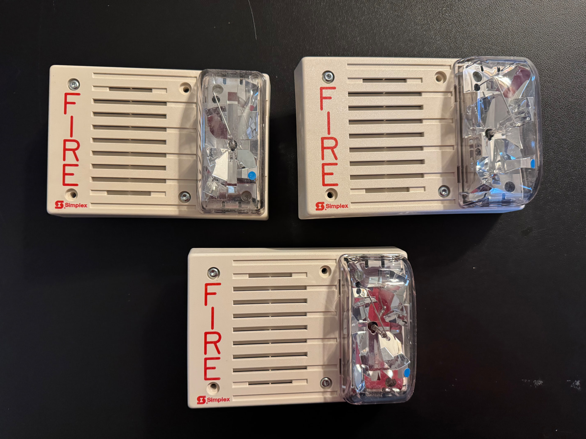 Got this very interesting trio of white NIB Simplex 4903-9423 Horn/Strobes rated for 30 CD (110 on-axis). These have sync only strobes and have the older electronic horns on them. The 4903-9423 is supposed to be a red horizontal sync model. However, I guess Simplex made some of these with a white housing as a special order sort of thing, hence probably why there is no label on the back of the strobe housing. These rectangular 4903s are my favorite wall mount notification appliances (especially in white) and I am more than happy to add them to my collection.